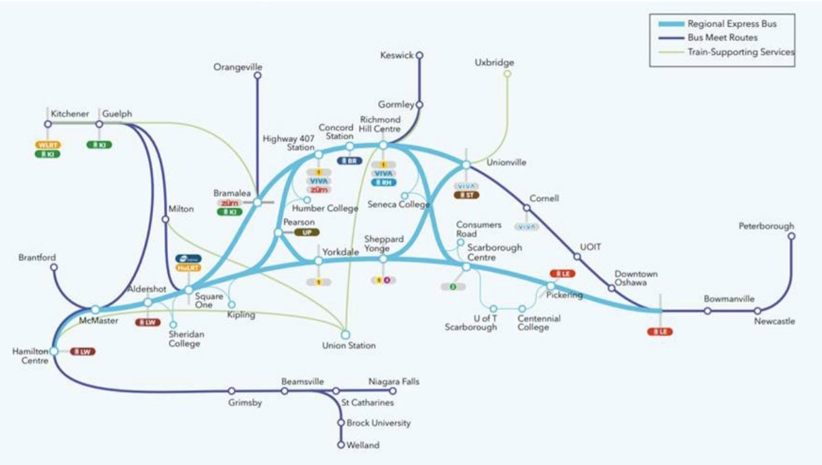 Many GO stations already have passable bus facilities with ticket machines and enclosed waiting areas, some newer subway stations – such as highway 407 also have these for use by regional buses. Better yet, good interchange points are available with a ton of rail services, including 5/7 GO rail lines, 2 Toronto Subway lines and likely more in the future as extensions and stations are added (Barrie Line Concord Station, and Line 2 Scarborough Extension for Example)